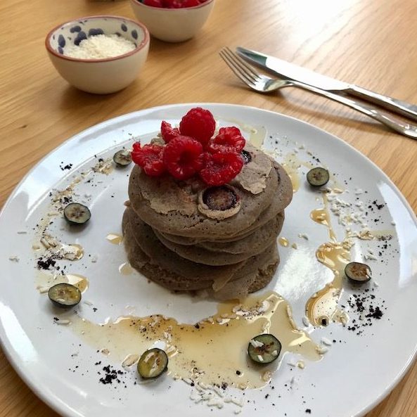 Spoon the coconut oil into a hot pan and pour in your pancake mix. Add the sliced blueberries whilst the mixture is still wet.