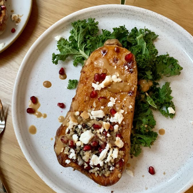 Add the kale to a plate as the base of the dish. Remove the squash from the oven, gently spoon the cooked quinoa into the de-seeded section and sprinkle over the feta.