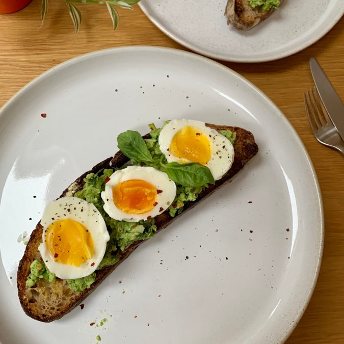 Plate up your toast before spooning over the pea and edamame smash, spreading evenly.