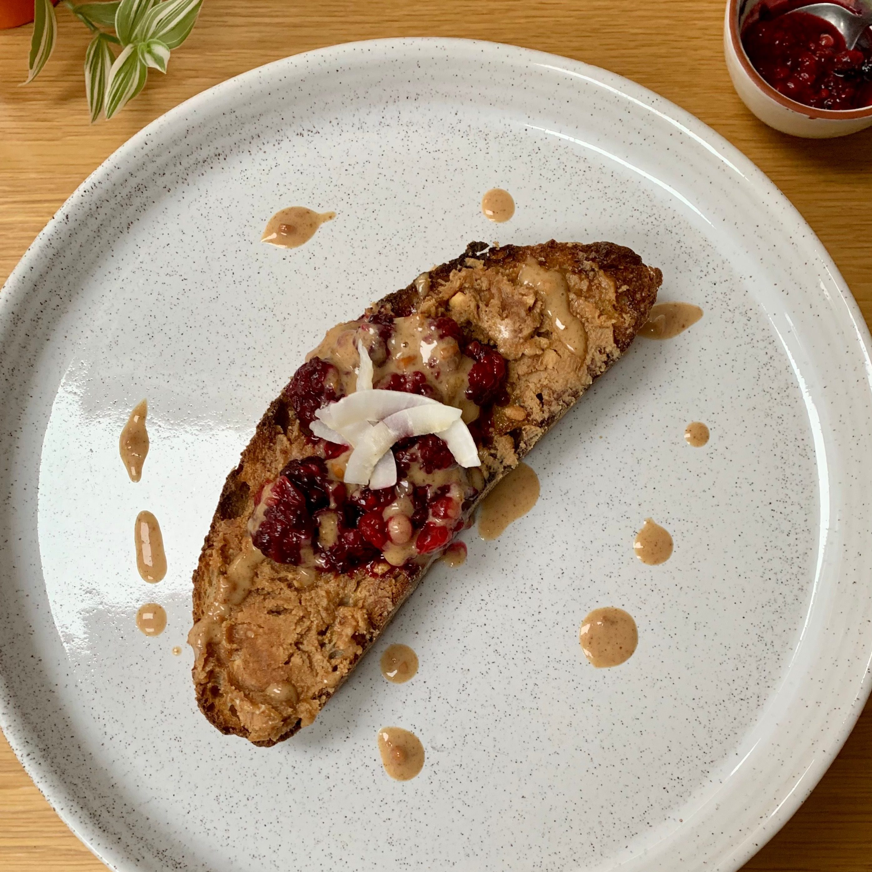 Meanwhile, toast your bread, pop it on a plate and spread over the peanut butter.