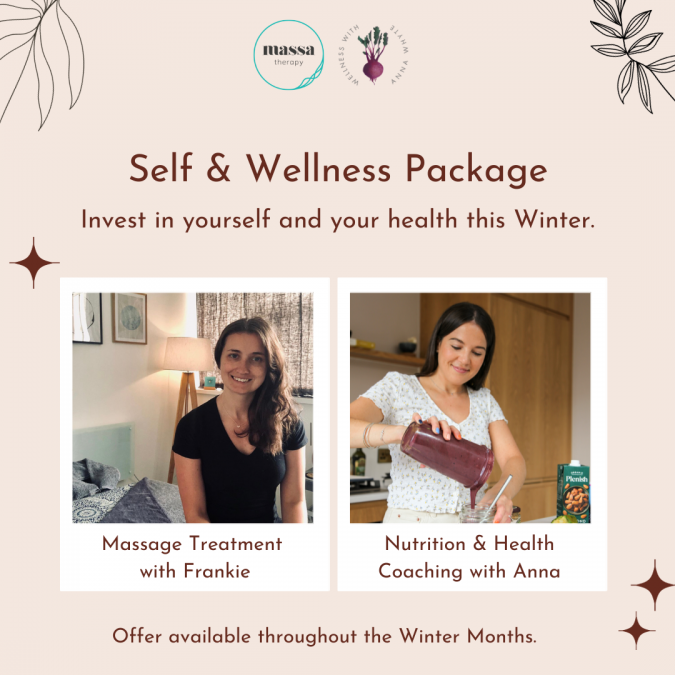 Invest in some time for yourself and your health with a 90 minute Massage Treatment with Frankie and a Nutrition & Health Coaching Session with Anna, in line with your current health status. We’ll throw in a winter wellness goodie bag too, as an added seasonal bonus!